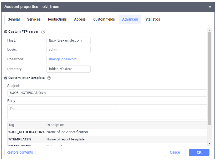 To specify the subject and text of the message sent by email as a result of a job or notification, activate the Custom letter template option and fill in the Subject and Body fields. The message body can contain tags which are converted to real values at the time of sending. Click on a tag to add it to the text.
