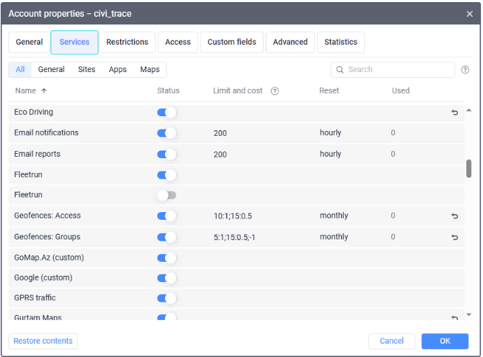Used | This column shows how many objects (units, drivers, etc.) are already created in the account. For uncountable types of services, such as SDK, eco driving, and so on, nothing is shown in the column. |
