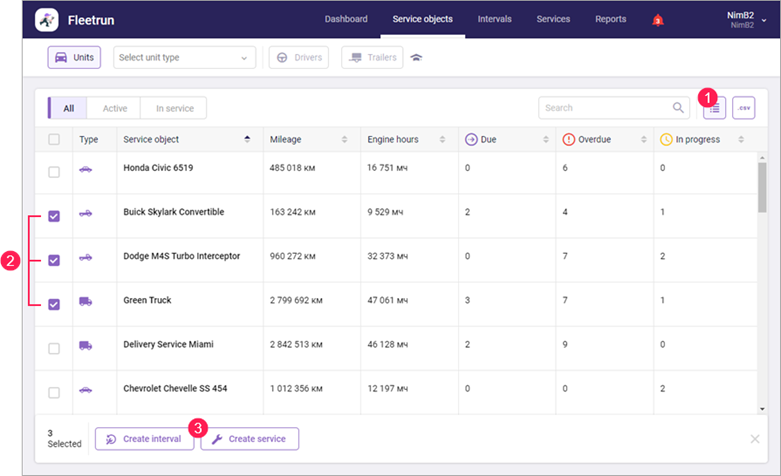 On the Service objects page, you can create intervals and services for several units, drivers, and/or trailers at once. To perform these operations, follow the steps below.