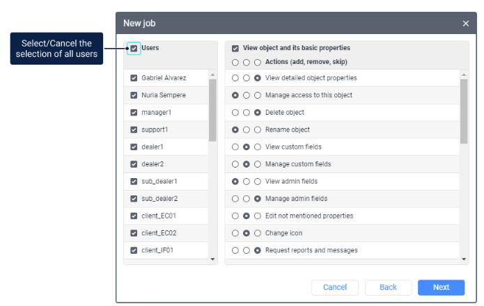 To create a job of this type, follow the guide to creating jobs. In step 4, select the users and select a new set of rights for them as follows: