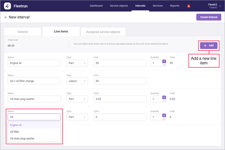 On the Line items tab, you can indicate the cost of spare parts and labour for the service interval.