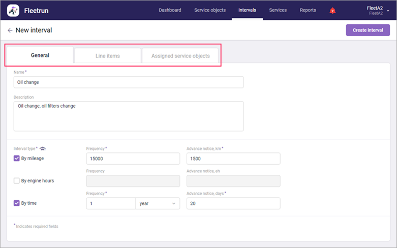 The basic properties of the service interval are indicated on the General tab: its name, description, frequency and terms of advance creation of its services. The required fields are marked with and asterisk (*).