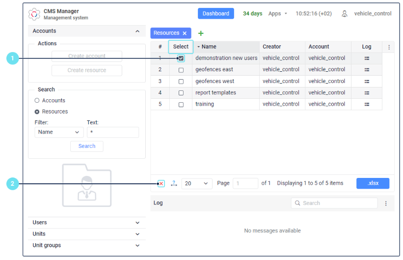 To delete a resource, select it in the table (the Select column), click on the icon in the tool panel, and confirm the action in the window that opens.