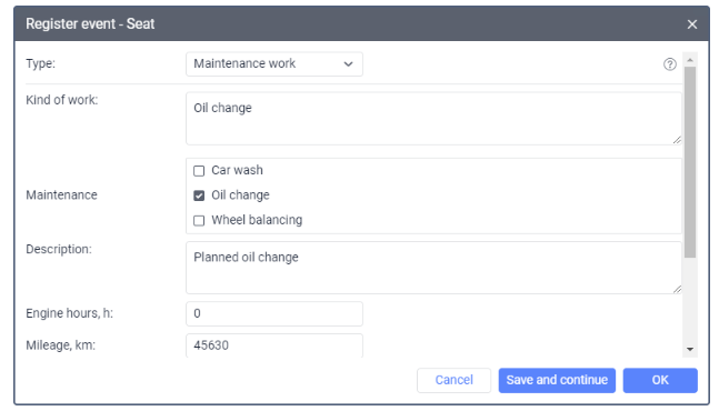 Select this type to register a maintenance service for the unit and specify its cost. This allows you to record maintenance costs and reset service intervals so that the system starts the countdown to the next service based on these intervals again.