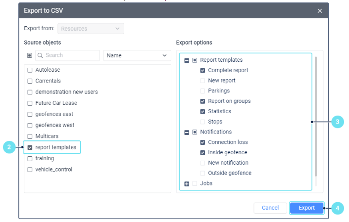 ) and select the required ones. If you mark several resources, all the objects of the selected type are exported.