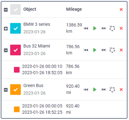 You can sort the tracks in the list by unit name or mileage. To do this, click on the Object or Mileage heading, respectively. Click on the heading again to reverse the sorting order.