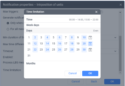 Time limitation | The setting which allows you to specify the time and select the days and/or months during which the notification parameters should be controlled. For example, they can be controlled only on weekdays and within working hours, or only on odd days, and so on. You can learn how to set a time limitation below. Unlike the time limitation applied to the Max triggers parameter, this setting takes into account the time the message was generated, and not the time it was registered on the server. Therefore, even if a message generated on the specified day or interval is unloaded from the black box at a time when the notification parameters shouldn’t be controlled, the notification is still triggered. The exceptions are the notifications of the Alarm and Connection loss types where the time of the message registration on the server is taken into account. |