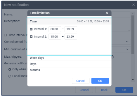 If you specify a limitation only in the Time section, the notification parameters are monitored during the specified intervals every day. If you select days and months in addition to the time intervals, the system controls the notification parameters during the specified intervals only on these days and months. If you specify a limitation only in the Months section, the notification parameters are constantly monitored during the selected months.