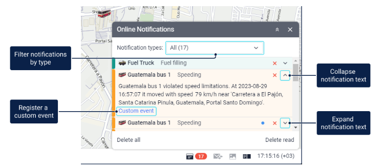 To delete a notification, click on the button next to its name. You can also delete all notifications or the read ones by clicking Delete all or Delete read at the bottom of the window of online notifications.