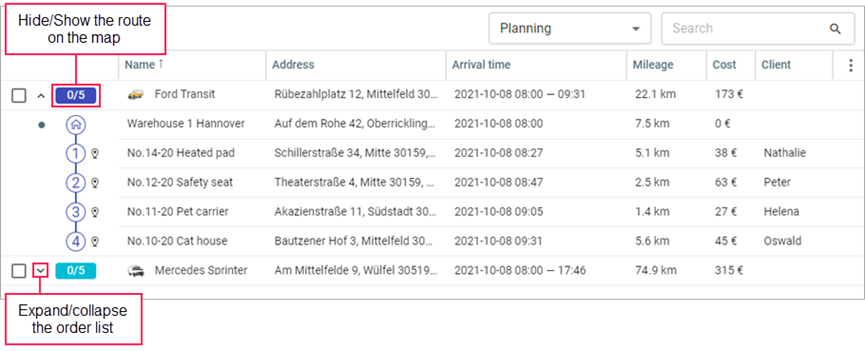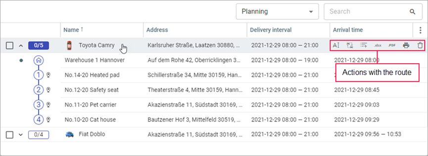 The table of routes shows the routes the state of which corresponds to the one selected in the filter, and the orders they consist of. To expand or collapse the list of the route orders, use the icons
