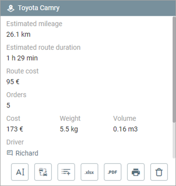 - Estimated service time - the total service time for all the orders of the route. A row with an orders showd the time that the driver should spend at the delivery point, including the time for unloading goods and charging the client.