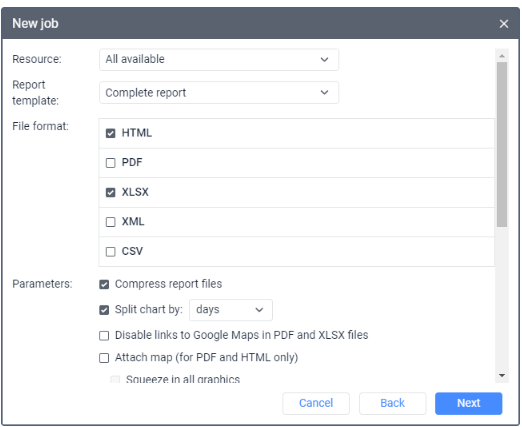 File format* | Select one or more file formats: HTML, PDF, Excel, XML, CSV. When you select the PDF format, you can specify the page orientation, size, and width. If you select the CSV format, you can specify the coding and delimiter, and enable or disable the display of column headers. Read more about report formats on the Exporting report to files page. |