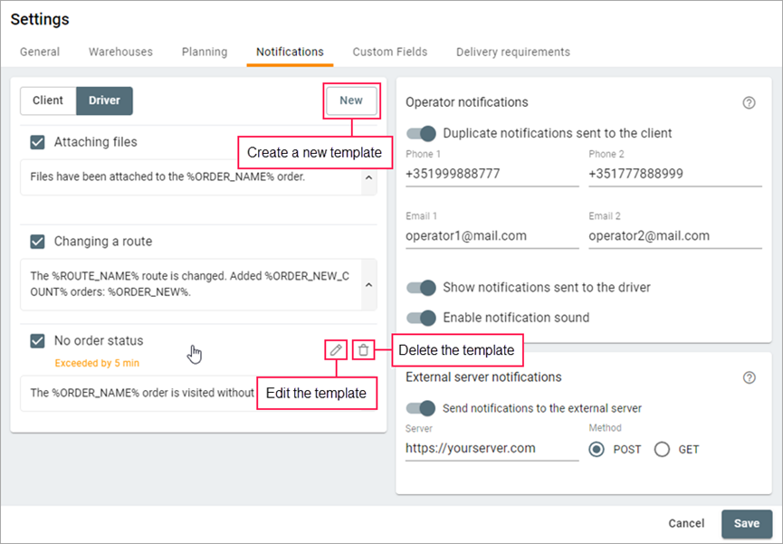 Operation NotificationsThe operator can receive the same notifications as the client or driver. This means that you should create and configure notifications for the client and/or driver first