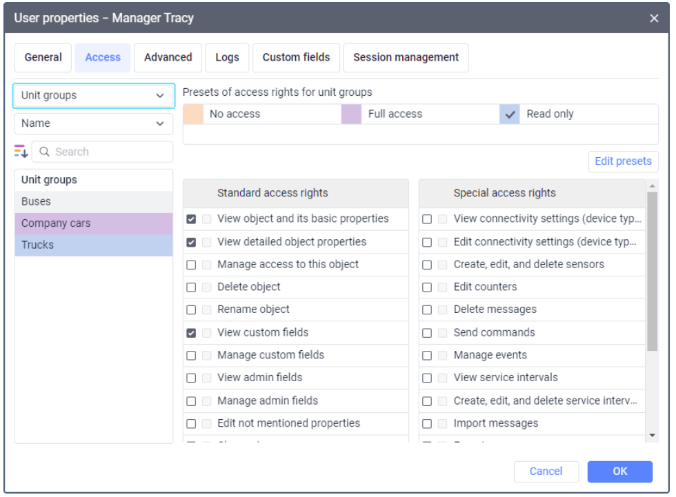 Manage custom fields | Allows creating, deleting, changing general custom fields in the properties of the group and its units. Also, allows editing the content of the Profile tab in the unit properties. This access right works only in combination with the previous one |
