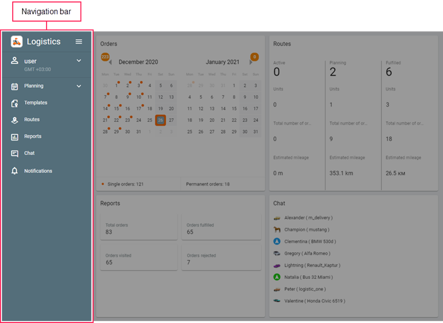 User Interface This interface is available for users who have access to the fleet. The window of the application consists of a navigation bar located at the top and a workspace occupying the rest of the window. In the navigation bar you can select ...